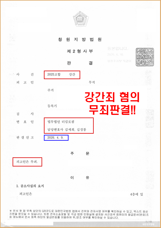 더킴로펌 형사전문변호사는 사건 초기부터 체계적인 변호 전략을 수립하였습니다. 피해자의 신체에서 폭행의 흔적이 발견되지 않았고, 사건 당일 경찰에 대한 진술과 이후 수사 및 공판 과정에서의 진술 사이에 모순이 존재한다는 점을 밝혀냈습니다. 또한 현장에 있던 주점 직원의 증언과 사건 당시의 구체적인 정황을 종합적으로 분석하여 피해자 진술의 신빙성을 탄핵하였습니다. 그 결과 재판부는 공소사실이 합리적 의심의 여지 없이 증명되지 않았다고 판단하여 의뢰인에게 무죄를 선고하였습니다.