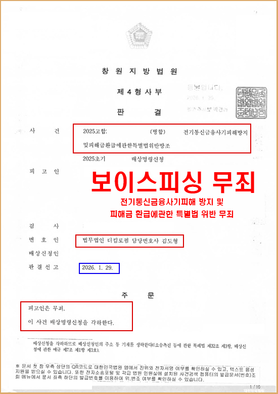 따라서 전기통신금융사기 방조 혐의나 보이스피싱 가담 의혹으로 수사를 받게 된 경우, 초기 수사 단계에서부터 사실관계와 법리를 정확히 검토한 뒤 대응 전략을 마련하는 것이 매우 중요하며, 사건의 구조와 증거관계를 체계적으로 분석하여 대응한다면, 이번 사례와 같이 억울한 형사책임을 벗어날 가능성도 충분히 존재함을 명심할 필요가 있겠습니다.